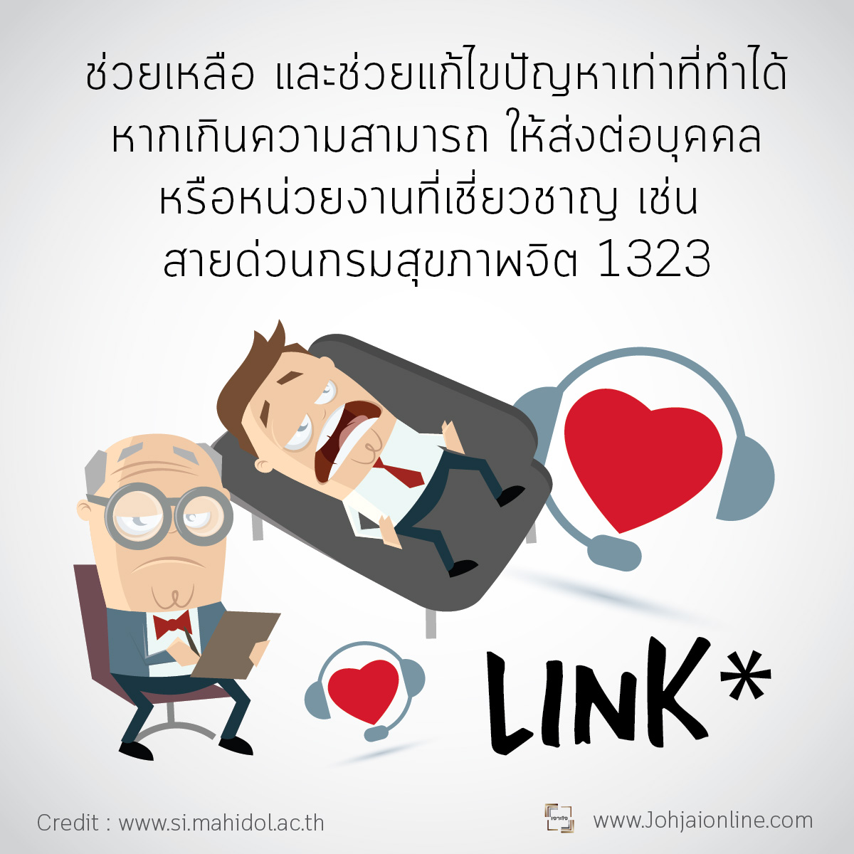 ช่วยเหลือ และช่วยแก้ไขปัญหาเท่าที่ทำได้ หากเกินความสามารถ ให้ส่งต่อบุคคล หรือหน่วยงานที่เชี่ยวชาญ เช่น สายด่วนกรมสุขภาพจิต 1323