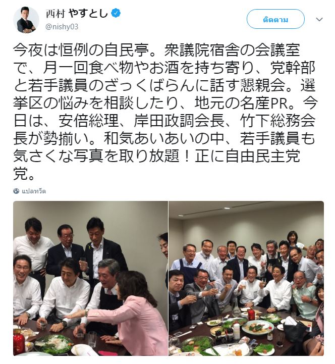 ต้นเหตุของเรื่องนี้มาจากโพสต์ในทวิตเตอร์ของนายยะสุโตชิ นิชิมุระ นักการเมืองสังกัดพรรคประชาธิปไตยเสรี (แอลดีพี) ที่โพสต์รูปเจ้าปัญหานี้ ทั้งยังบรรยายรูปโดยจับใจความได้ว่า เมื่อคืนระหว่างการเลี้ยงฉลองครั้งนี้ ได้พูดคุยเกี่ยวกับเรื่องปัญหาในพื้นที่ของ ส.ส. แต่ละคน และการทำประชาสัมพันธ์ในท้องถิ่น