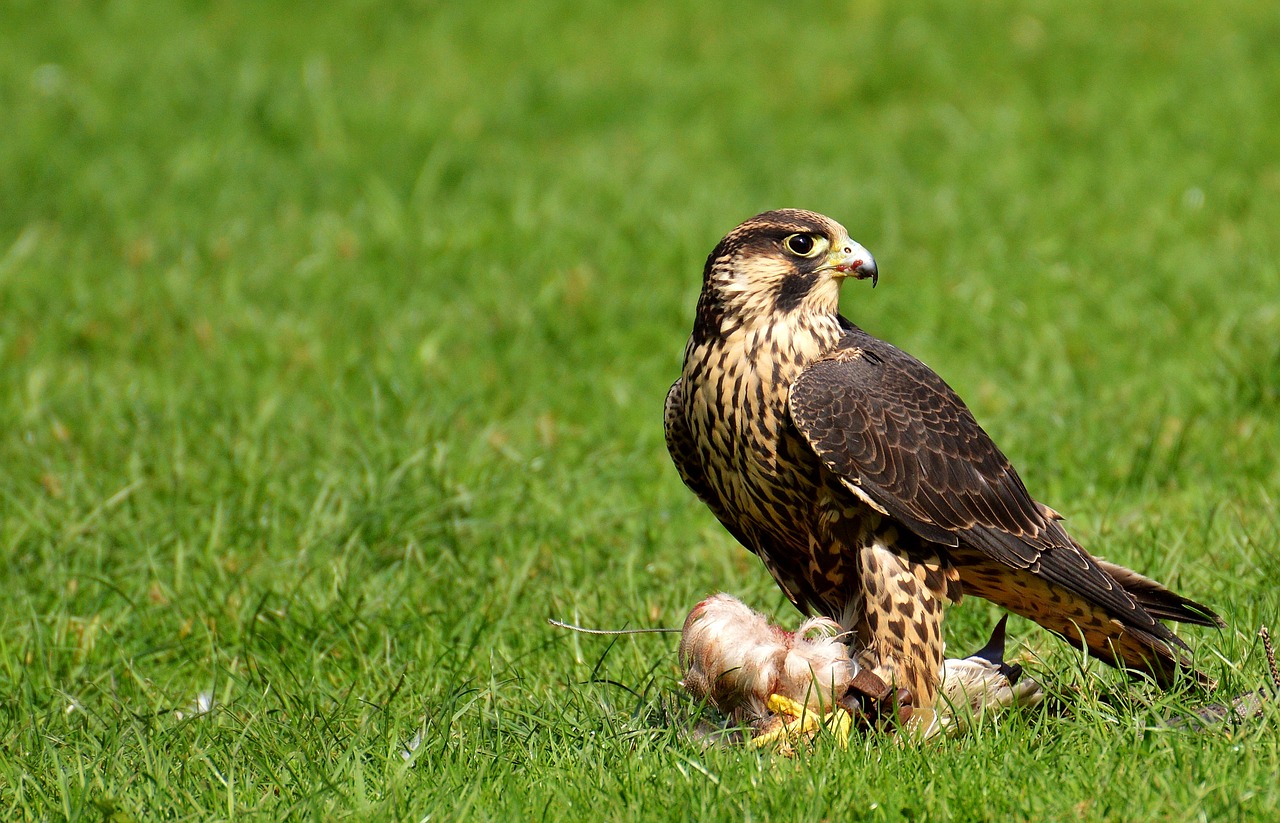 เหยี่ยวเพเรกรินจัดอยู่ในวงศ์เหยี่ยวปีกแหลม เป็นนกที่กินนกอื่นเป็นอาหาร มันล่าสัตว์กลางอากาศ ซึ่งแน่นอนว่าต้องใช้ความเร็วสูงมากในการพุ่งเข้าหาเหยื่อก่อนที่เหยื่อของมันจะรู้ตัวบินหลบเข้าพุ่มไม้ได้ทัน เหยือของเพเรกรินนั้นนอกจากนกพิราบ และนกสกัว มันยังล่านกทุกชนิดที่บางชนิดมีขนาดและน้ำหนักมากกว่าตัวมันเป็นอาหาร เช่นนกเป็ดน้ำ จนได้รับฉายาคนอเมริกันว่า “duck hawk” ในบางครั้งก็พบว่าเหยี่ยวเพเรกรินพุ่งเข้าโจมตีนกล่าเหยื่อด้วยกัน เช่นอินทรี หรือนกเค้าแมว ด้วยความได้เปรียบนกอื่นในด้านความเร็วทำให้มันไม่เคยกลัวนกใดที่กำลังบินอยู่กลางอากาศเลย