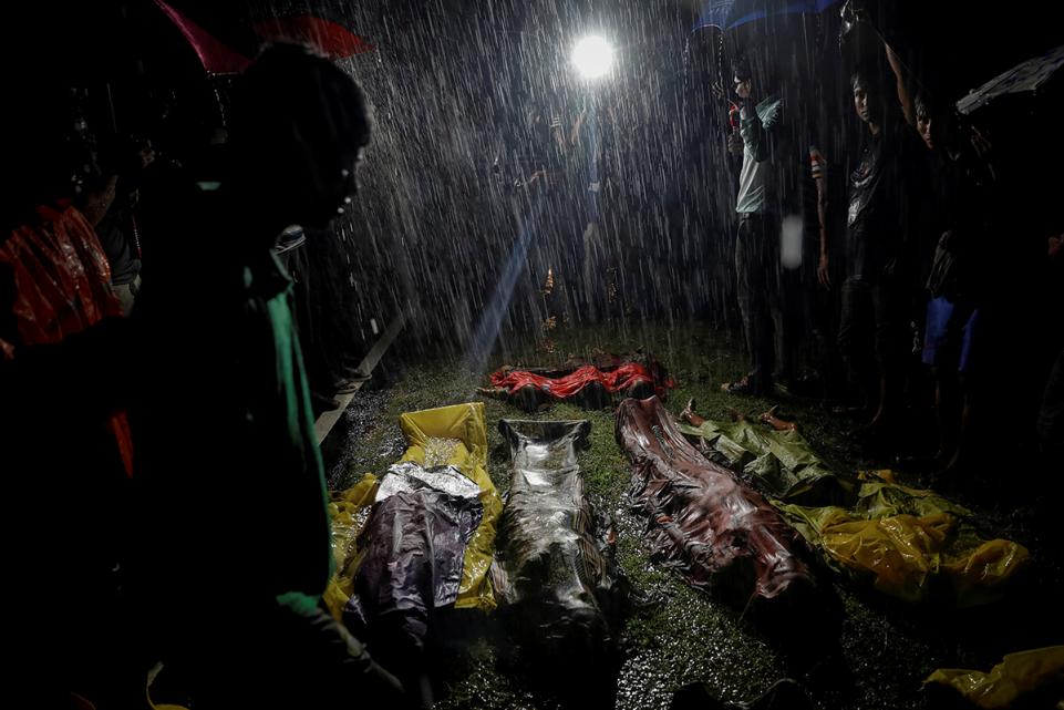 32.ขณะที่ฝนตกหนักผู้คนมารวมตัวกันรอบ ๆ ผู้ลี้ภัยชาวโรฮิงญาที่หลบหนีความรุนแรงจากพม่า หลังจากที่เรือของพวกเขาล่ม ณ หาด Inani ที่อยู่ใกล้กับตลาด Cox's Bazar ประเทศบังคลาเทศ เมื่อวันที่ 28 กันยายน 2017