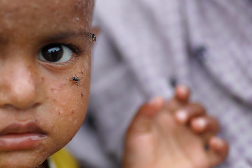 38.แมลงวันเกาะบนบนใบหน้าของเด็กน้อยผู้ลี้ภัยชาวโรฮิงญาคนหนึ่ง ที่กำลังรอคอยการแจกจ่ายอาหารในค่ายผู้หลีภัยใกล้กับ Cox's Bazar ประเทศบังคลาเทศ เมื่อวันที่ 8 ตุลาคม 2017