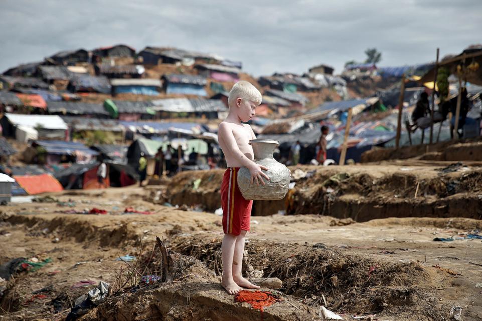 39.เด็กเผือกผู้ลี้ภัยชาวโรฮิงญาที่ถือเหยือกน้ำภายในค่ายใน Cox's Bazar, บังคลาเทศ เมื่อวันที่ 27 กันยายน 2017