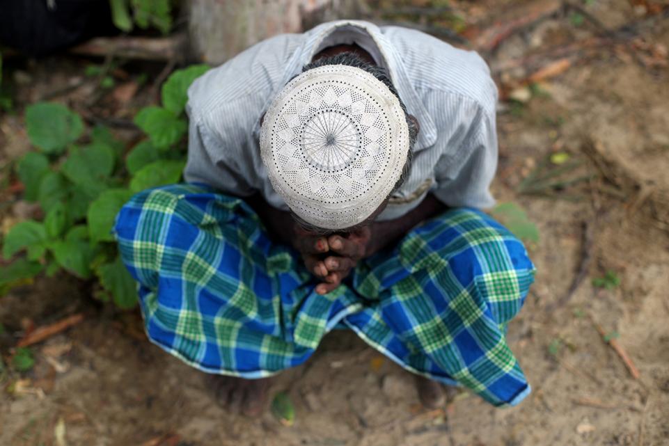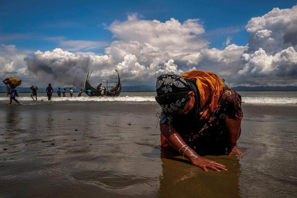 43.ผู้ลี้ภัยชาวโรฮิงญาที่ก้มลงสัมผัสพื้นชายหาดหลังจากเดินทางข้ามอ่าวเบงกอลจากพม่ามาถึงบังคลาเทศเมื่อวันที่ 11 กันยายน 2017