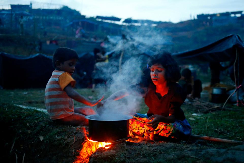 54.เด็กสาวชาวโรฮิงญาคนหนึ่งกำลังเตรียมอาหารที่ค่ายผู้ลี้ภัย Balukhali ใน Cox's Bazar, บังคลาเทศ