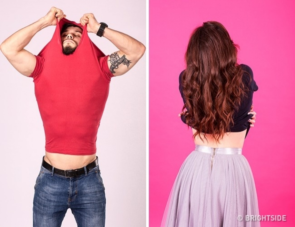 ผู้ชายถอดเสื้อโดยจับที่คอเสื้อตรงๆส่วนผู้หญิงจะค่อยๆถอดจากด้านข้าง นั่นหมายความว่าผู้ชายชอบใช้ส่วนที่แข็งแรงที่สุดในร่างกายนั่นคือแขน ส่วนผู้หญิงจะออกแรงด้วยการใช้ทั้งตัว