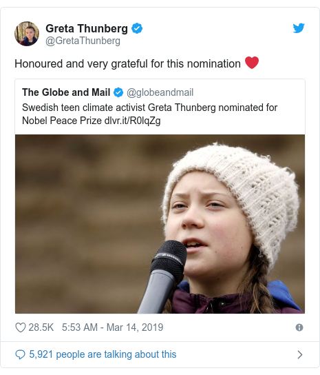 ณ เมืองสวีเดน มีผู้ขับเคลื่อนและเป็นนักรณรงค์เพื่อสิ่งแวดล้อม ผู้ริเริ่มการหยุดโรงเรียนเพื่อประท้วงปัญหาทางด้านโลกร้อนบริเวณหน้ารัฐสภาจนสร้างชื่อให้เธอไม่น้อย และเป็นนักสร้างแรงบันดาลใจจนเป็นผู้นำทางด้านการเคลื่อนไหวต่อต้านปัญหาการเปลี่ยนแปลงทางสภาพภูมิอากาศ จนได้รับการเสนอชื่อเข้าชิงโนเบลสาขาสันติภาพในปีนี้