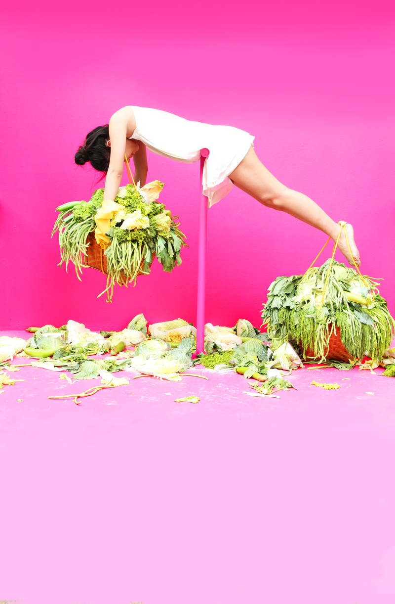 กลัวนะคะ คือมันไม่ได้มีระบบเซฟตี้ขนาดนั้น จะมีก็แค่คนที่จะคอยช่วยจับอยู่ข้างๆถ้าสมมุติเกิดตกลงมาแค่นั้นค่ะ แต่สำหรับแพรวมันก็ไม่ได้อันตรายอะไรมาก มันเป็นแค่ความรู้สึกหนักมากกว่าที่ขาก็ต้องเกี่ยวตะกร้าไว้ ส่วนแขนก็ต้องประคองตะกร้าไว้ แล้วก็ต้องพยายาม Balance ช่วงตัวพยายามทำตัวให้บาลานซ์ที่สุด แล้วก็เริ่มทดสอบตั้งแต่น้ำหนักน้อยไปจนถึงน้ำหนักมากจากที่ตอนแรกตะกร้าไม่มีของอะไรเลย ตอนหลังตะกร้าก็เริ่มมีผักที่ถูกโยนเข้ามาใส่จนเต็มและหนักมากขึ้นเรื่อยๆ จนตอนท้ายก็จะเป็นแบบ Extreme เลย โยนกันเข้ามาแบบถาโถมเพราะแพรวอยากให้มันเป็นเรื่องของการที่ร่างกายค่อยๆปรับเข้าสู่โหมดที่ว่า เราได้กลายเป็นอุปกรณ์ชิ้นนั้นแล้วจริงๆ