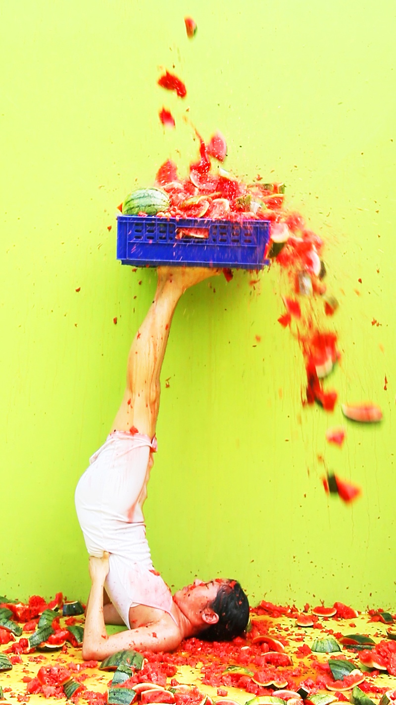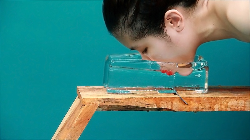อย่างเรื่องของปลากระป๋องที่คนซื้อมากิน จริงๆแล้วเบื้องหลังของมันอย่าง Fishing Industryที่อาจเคยเห็นกันในข่าวเนี่ย มันมีหลายประเด็นมากนะคะ ไม่ว่าจะเป็นเรื่องแรงงานผิดกฎหมายหรือสิทธิมนุษยชนที่คนเหล่านี้ถูก Treat ไม่ถูกต้อง คนเหล่านี้ไม่ถูกตีค่าว่าเป็นคนด้วยซ้ำแพรวก็ยิ่งรู้สึกว่าเรื่องนี้มันน่าสนใจมากๆ จากนั้นพอได้ไอเดียก็ค่อยจะแจกแจงเป็นแต่ละชิ้นงานแล้วพอได้แต่ละชิ้นงานปุ๊บ มันก็จะมาเกี่ยวข้องกับตัวแพรวเอง ที่แพรวเอาตัวเองเข้าไปเป็นเครื่องจักร หรืออุปกรณ์ต่างๆ ก็เลยกลายมาเป็น Content ที่มีชั้นของเรื่องราวค่ะแล้วก็ทำหน้าที่เหมือนอุปกรณ์เหล่านั้นจริงๆแต่ว่าการที่แพรวจะหายตัวจากการเป็นตัวเองเข้าไปสู่การเป็นอุปกรณ์นั้นๆแปลว่ากระบวนการนั้นๆมันน่าสนใจเค้าก็เลยเลือกทำเป็นวีดีโอเพราะว่าตอนแรกเนี่ยกำลังชักโครกกับการที่จะเป็นอุปกรณ์นั้นจะพอสักพักอ่ะแถวเริ่มรู้สึกว่าเขากลายเป็นอุปกรณ์นั้นจริงๆเช่นอย่างตอนเป็นคานตอนแรกๆก็อาจจะเจ็บ อาจจะมีความไม่ไหว แต่พอผ่านไปสักพักอ่ะเราจะเริ่มนิ่ง หรืออย่างงาน The Scale ก็เป็นตาชั่งเหมือนกัน แต่เป็นตาชั่งเดี่ยว แบบธรรมดาๆเลยแตงโมรวมกันทั้งหมดน่าจะประมาณ 60 ลูกที่ถูกโยนใส่ลงมาเรื่อยๆ